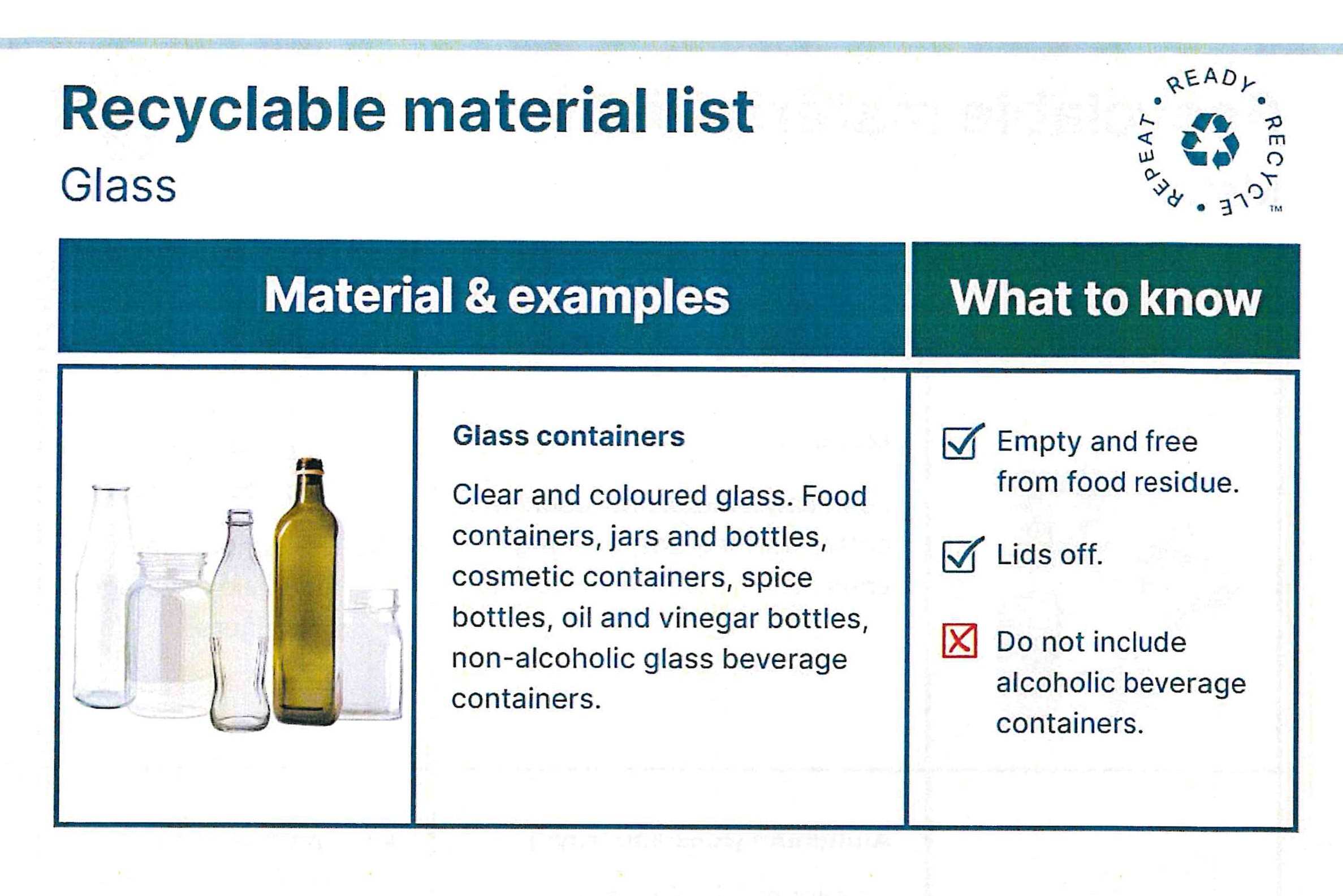 Clear & coloured glass. Food containers, jars and bottles, cosmetic containers, spice bottles, oil & vinegar bottles, non-alcoholic glass beverage containers. Empty & free from food residue. Lids off.