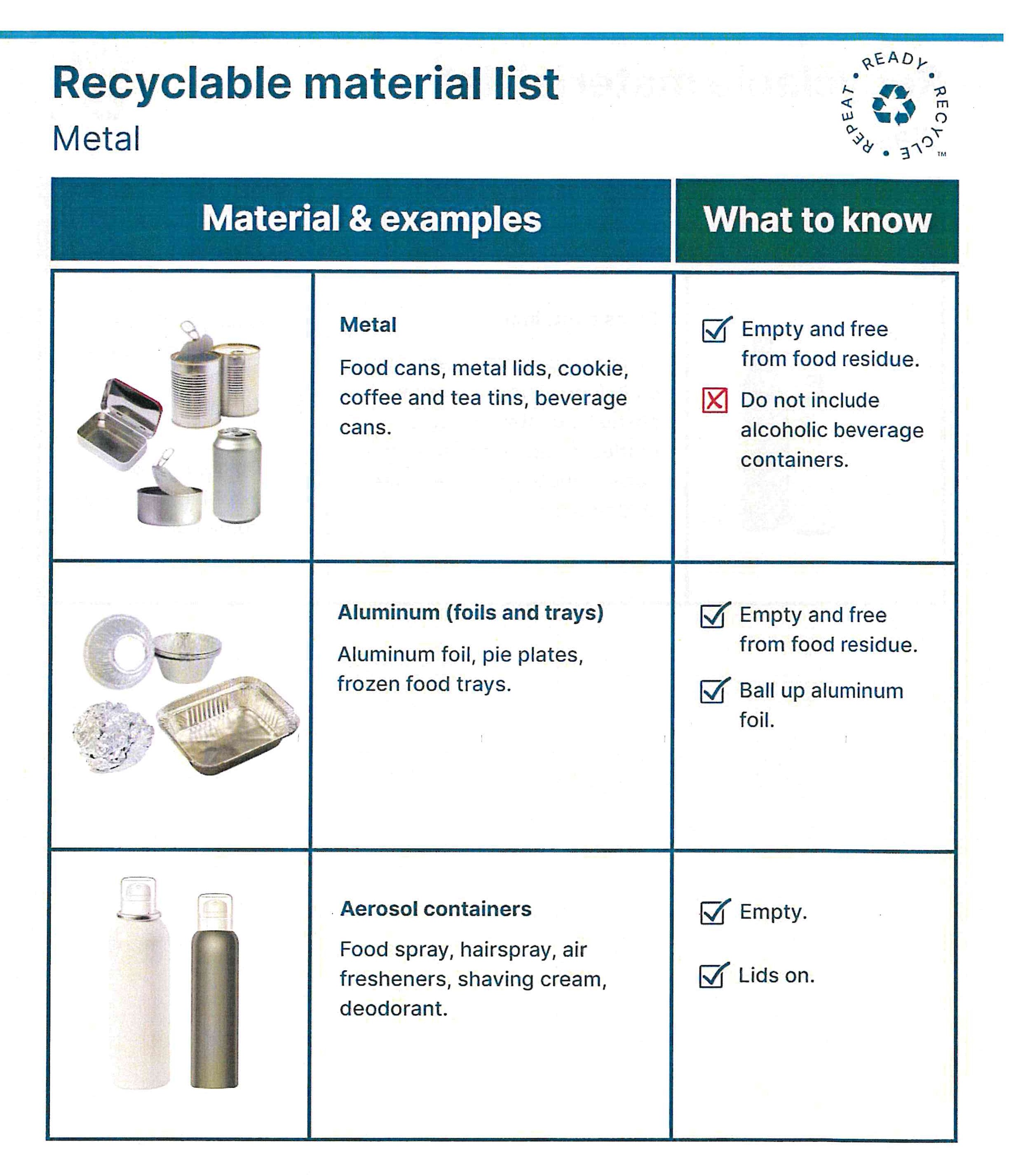Aluminum (foils & trays) – Aluminum foil (balled up), pie plates, frozen food trays. Empty & free from food residue.