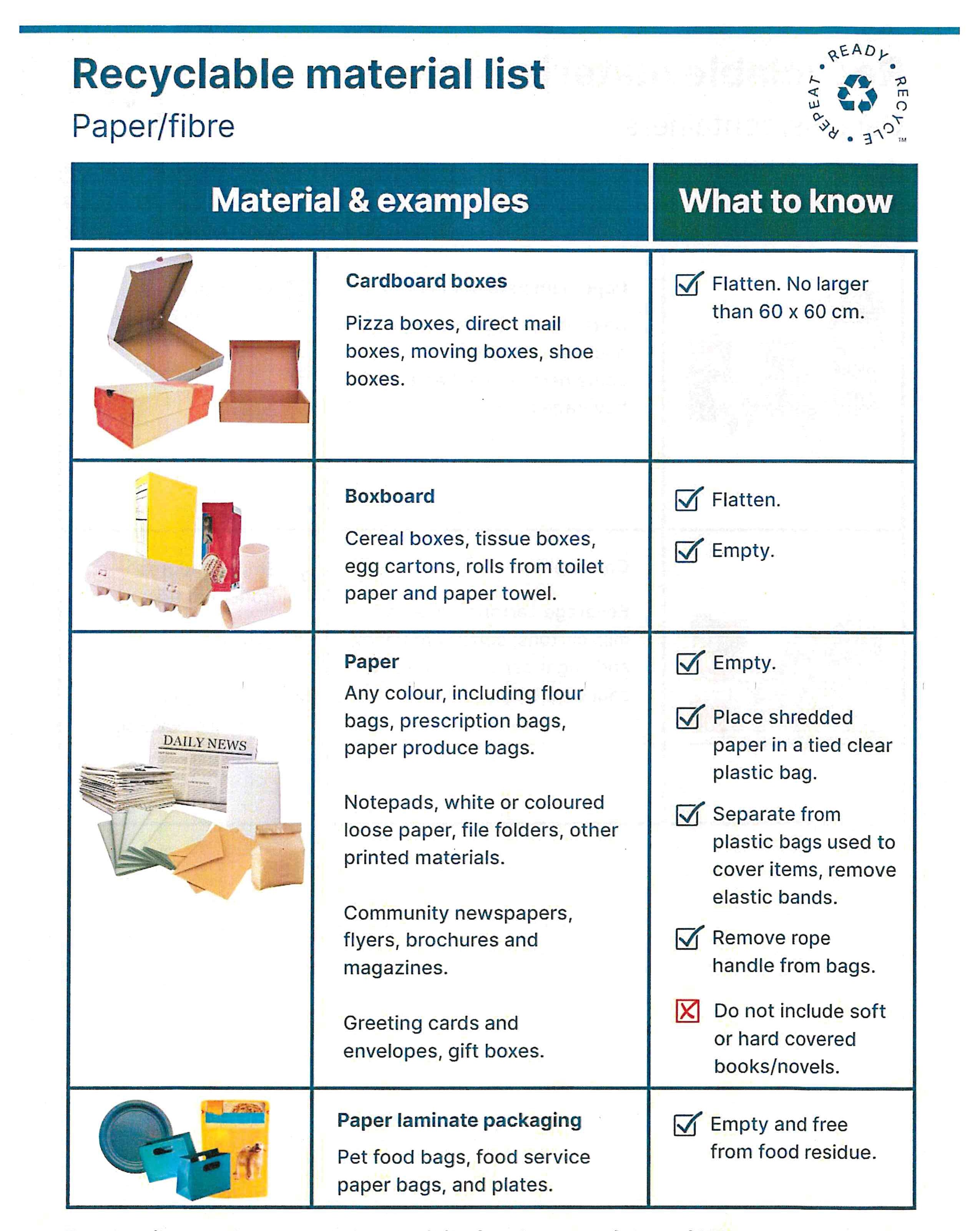 Paper - Any colour, including flour bags, prescription bags, paper produce bags. Notepads, white or coloured loose paper, file folders, other printed materials. Newspapers, flyers, brochures & magazines. Greeting cards & envelopes, gift boxes. Shredded paper (in a tied plastic bag). All packing must be empty, all plastic or elastic bands removed. Remove rope handles from paper bags.