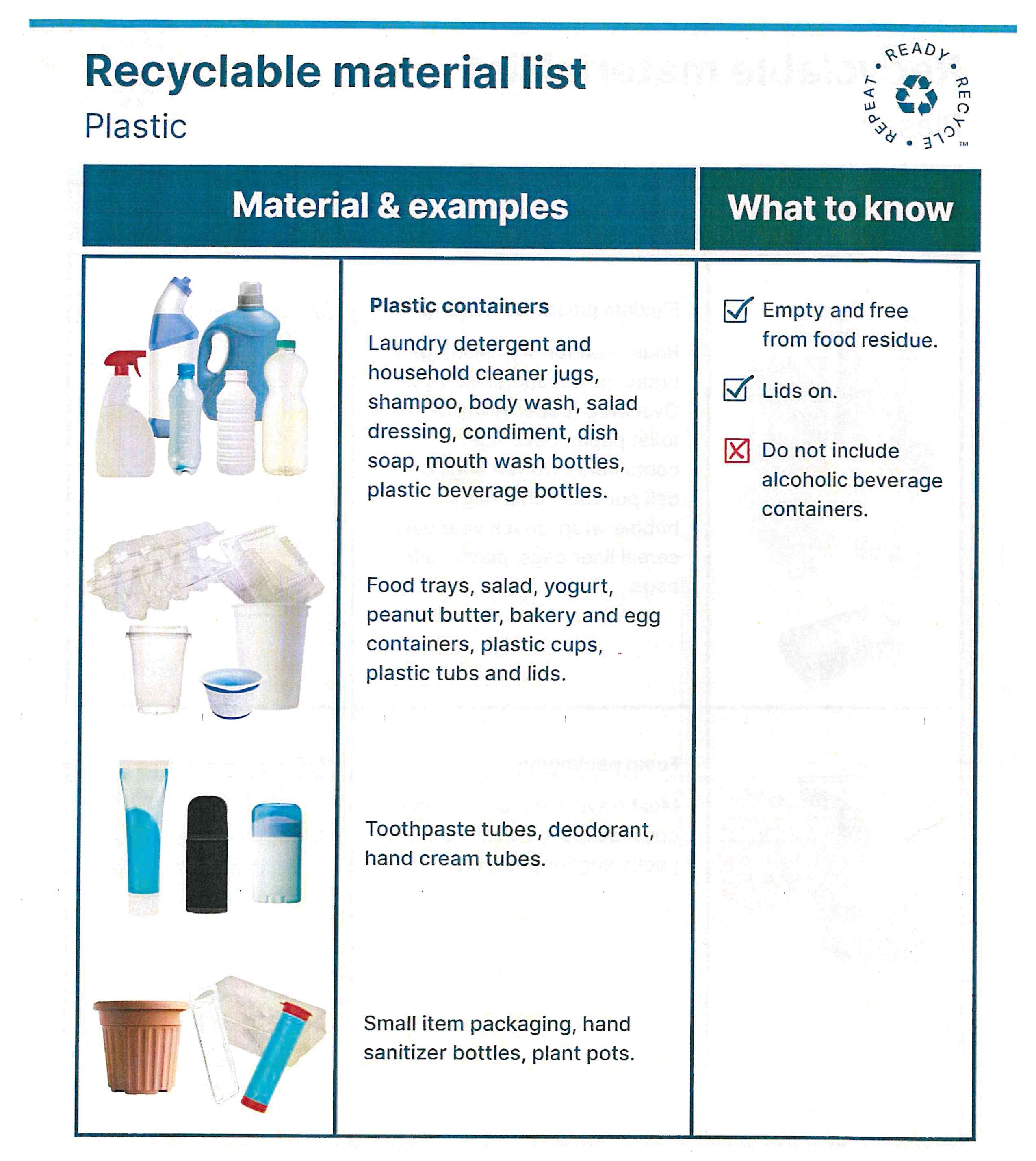 - Lids and labels can remain on plastic containers.