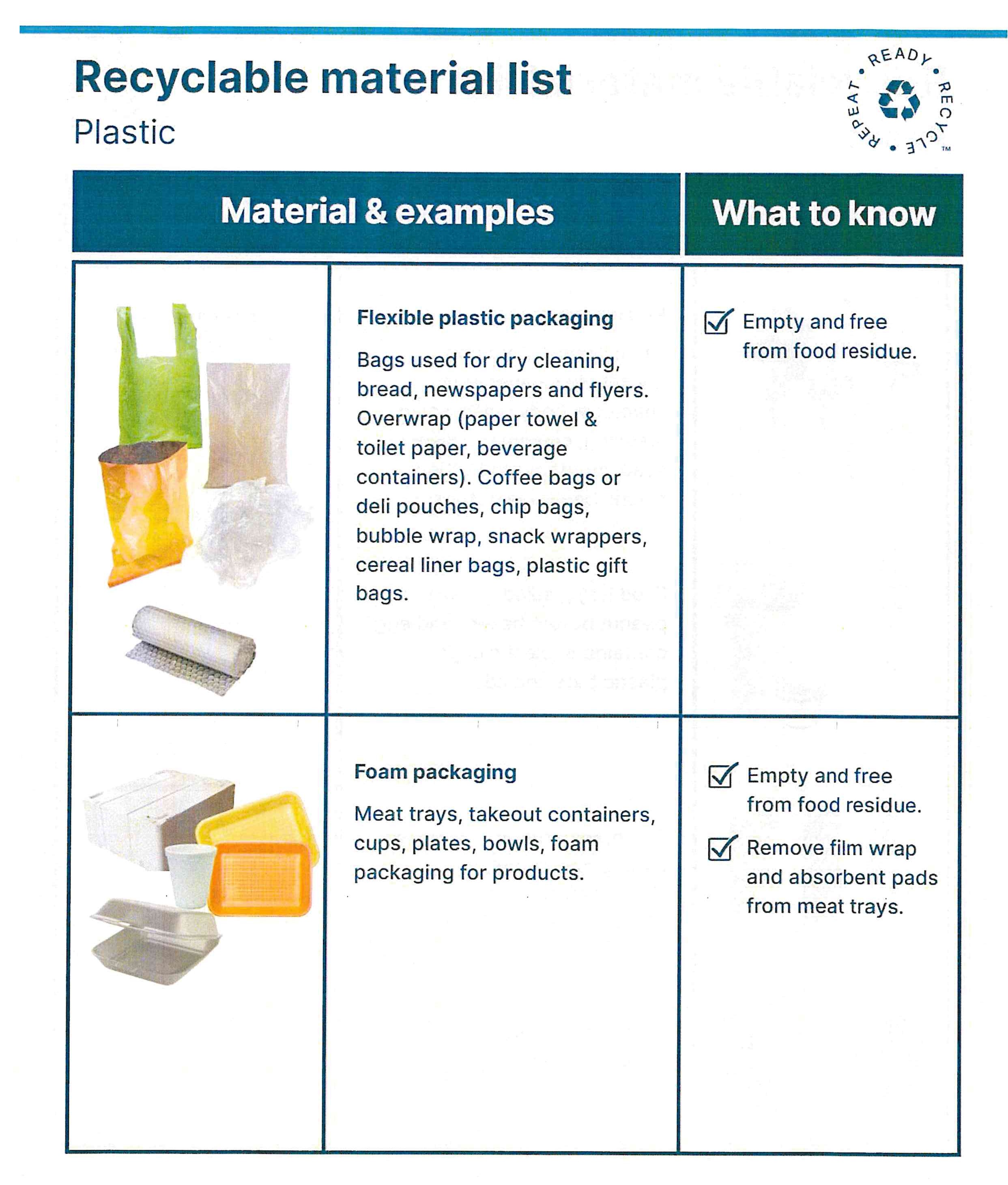 Foam Packaging – Meat trays, takeout containers, cups, plates, bowls, foam packaging for products. Empty & free from food residue. Remove film wrap & absorbent pads from meat trays.